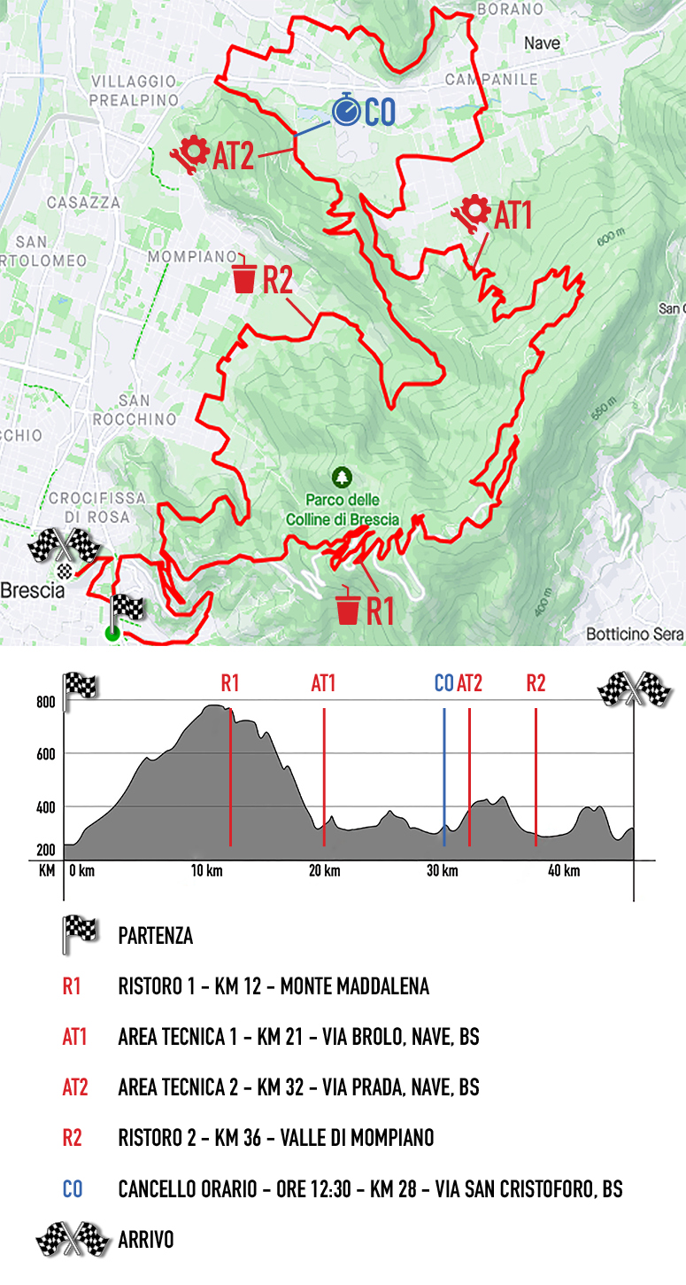 Il percorso presenterà sempre 1500 metri di dislivello, che spalmati sui 47 km regaleranno tratti tecnici e divertenti, con la partenza da Piazzale Arnaldo, fino a raggiungere vittoriosi l’ingresso del Castello di Brescia. Due saranno le aree tecniche, e tre i ristori, di cui due lungo il percorso ed uno all’arrivo.
