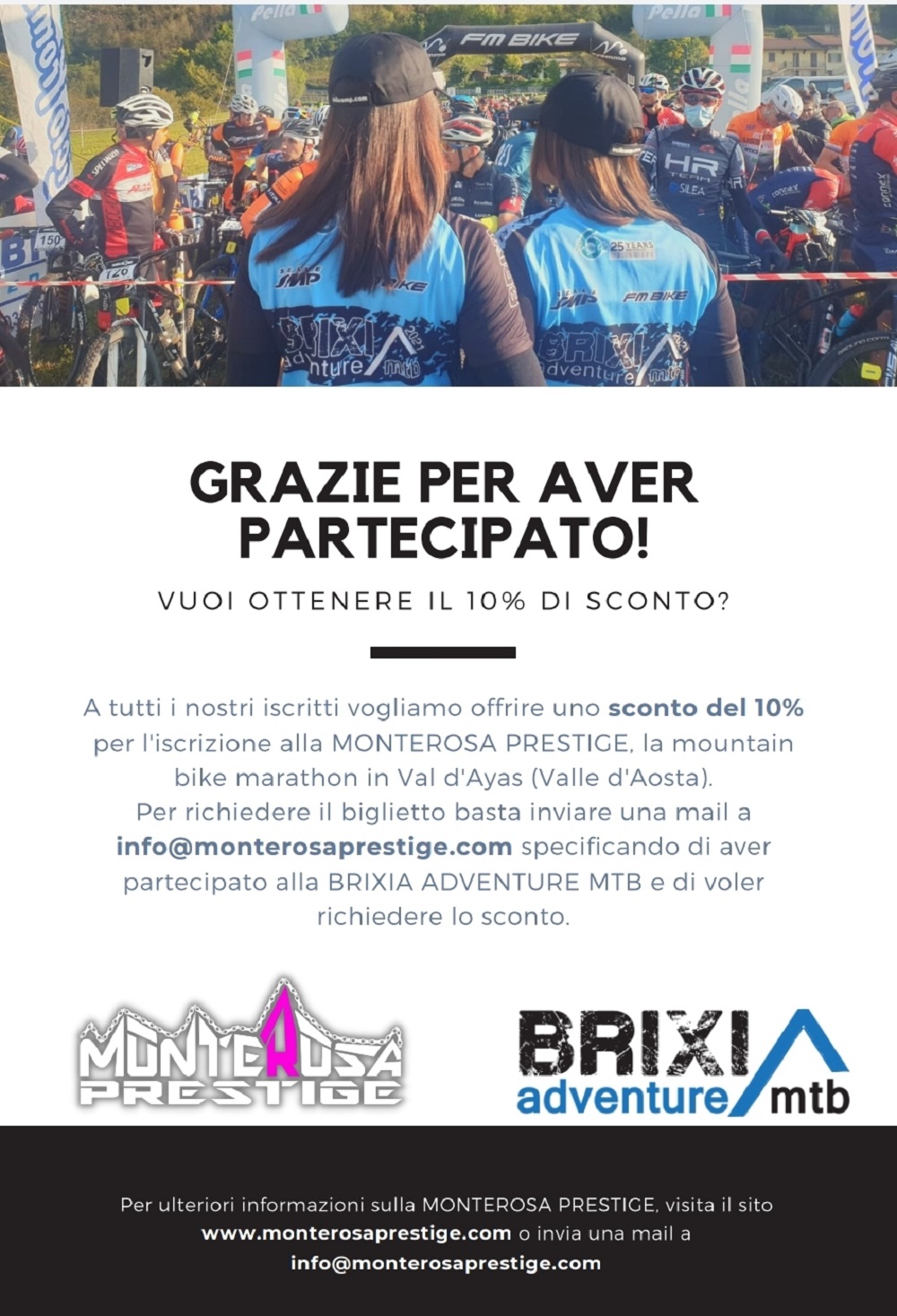 Non dimentichiamoci poi che nel pacco gara della Granfondo XTech Mtb Città di Brescia troveremo lo sconto del 10% per l’iscrizione alla rinomata Monterosa Prestige del 25 giugno 2022, grazie all’intesa con il Brixia Adventure Mtb, che inserirà il buono nel pacco gara di tutti i partecipanti alle prime 4 prove di circuito: